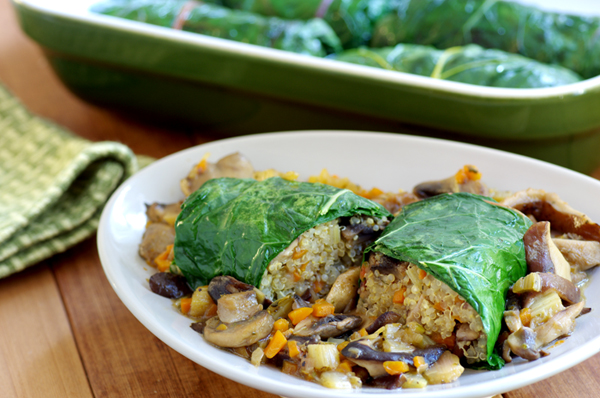 A relative of spinach and beets, Swiss chard offers fantastic antioxidant protection in the form of carotenoids, which help maintain eye health, boost immunity, and may even fight cancer. But, besides your standard "cook greens to death, maybe with bacon" method, what can you do with this slightly bitter leafy green with the colorful stems? Fresh, light, lovely—yet substantial enough to make a meal—these stuffed Swiss chard rolls are kind of a game changer. Who knew you could use Swiss chard's large, surprisingly strong, nutrient-rich leaves as a burrito-wrap substitute? As with most things here on our food blog, you could stuff a chard leaf with pretty much anything (let your imagination run wild!), but here we have a delectable mix of ancient quinoa—available now in bulk at the Co-op— and mushrooms for an earthy and elegant vegetarian meal. To make them softer, more delicious, and easier to roll up, this recipe calls for blanching the chard leaves before adding the filling, you could use this same technique with collards, gomen, or non-curly kale.